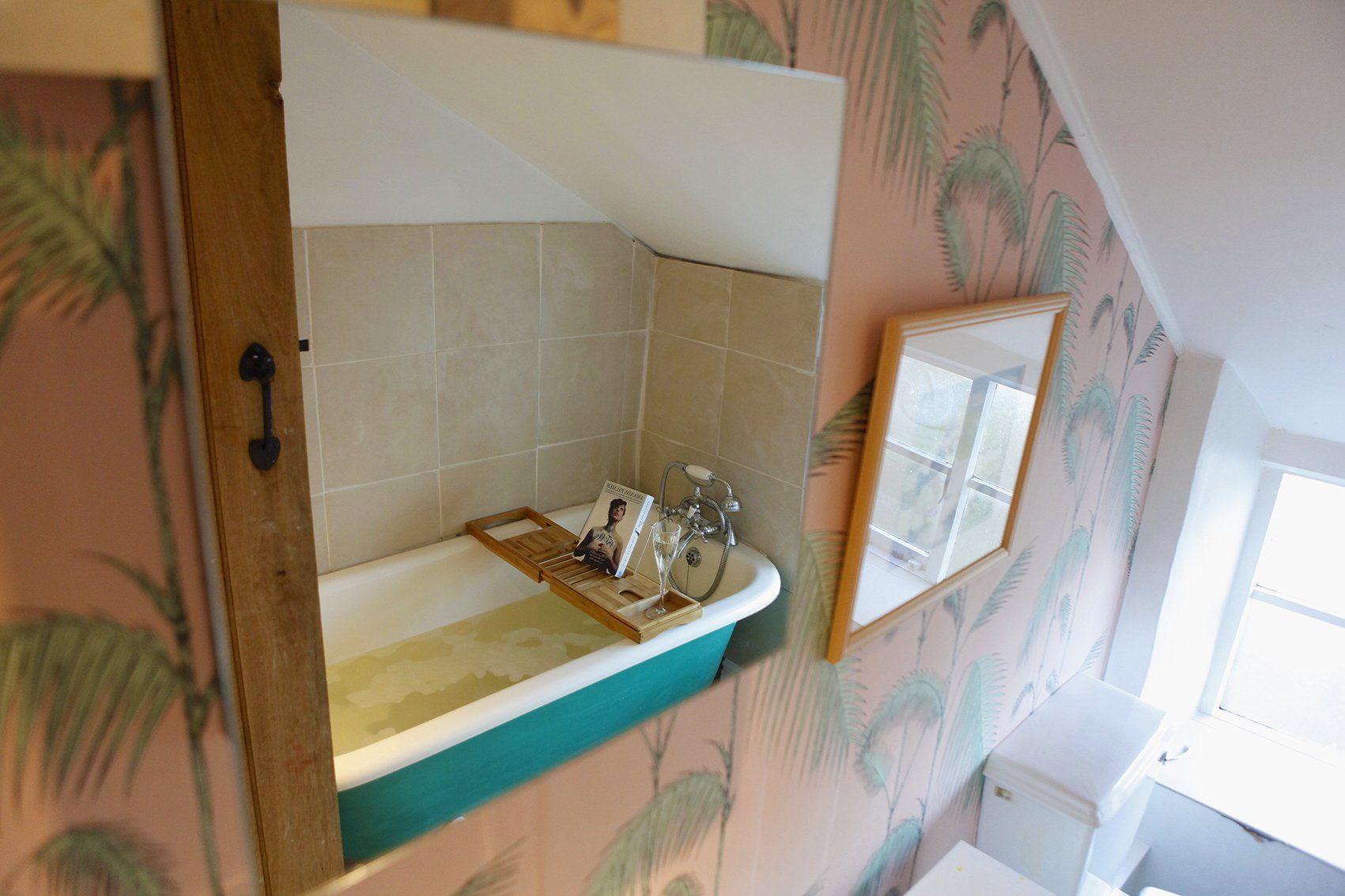 Situated in the main farmhouse, this king size bedroom overlooks the mini orchard and fields and is decorated in a contemporary style with botanical wallpaper and a bronze bedframe with forest green accents.