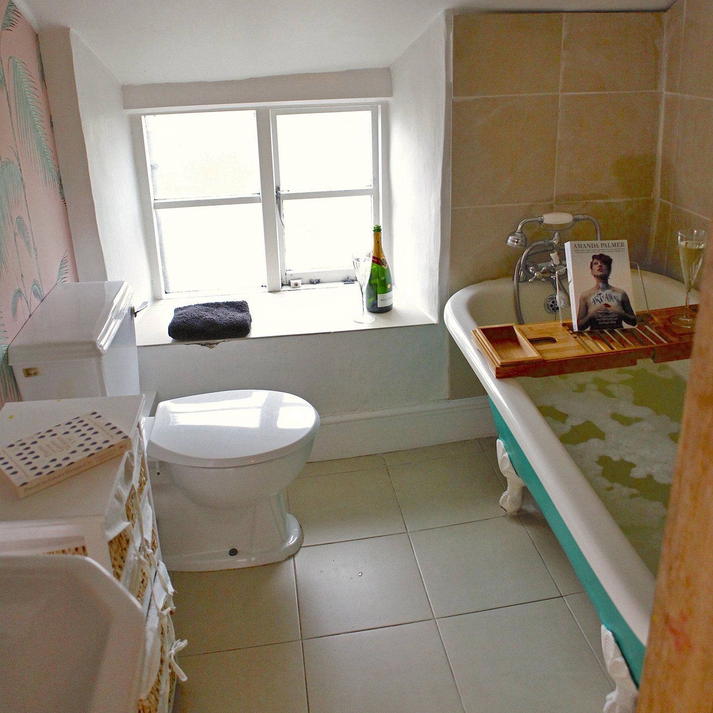Split level guest suite with downstairs lounge area, upstairs king size mezzanine bedroom and downstairs big bathroom with claw foot roll top bath, separate shower and wc/basin.