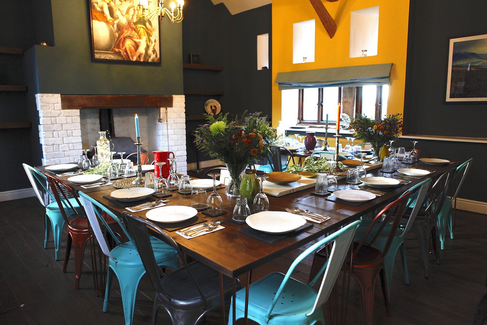 Westbrook Court's signature space for your celebration event is our dramatic dining hall with high ceilings and exposed beams. This impressive yet cosy double height beamed dining hall with wood burning stove offers a flexible celebration set up of either sit down meal for 21 or stand up cocktail & canape event for more.